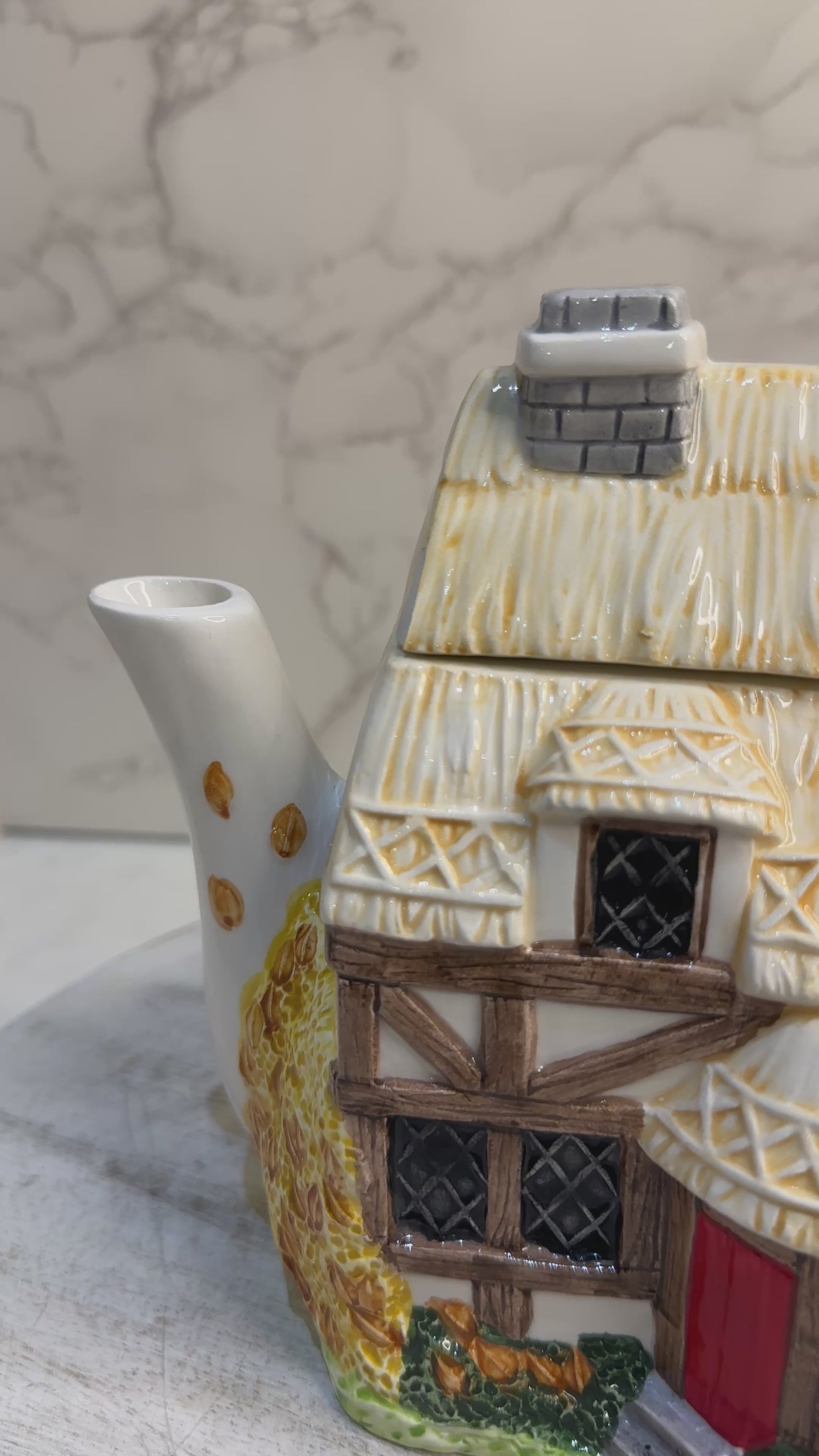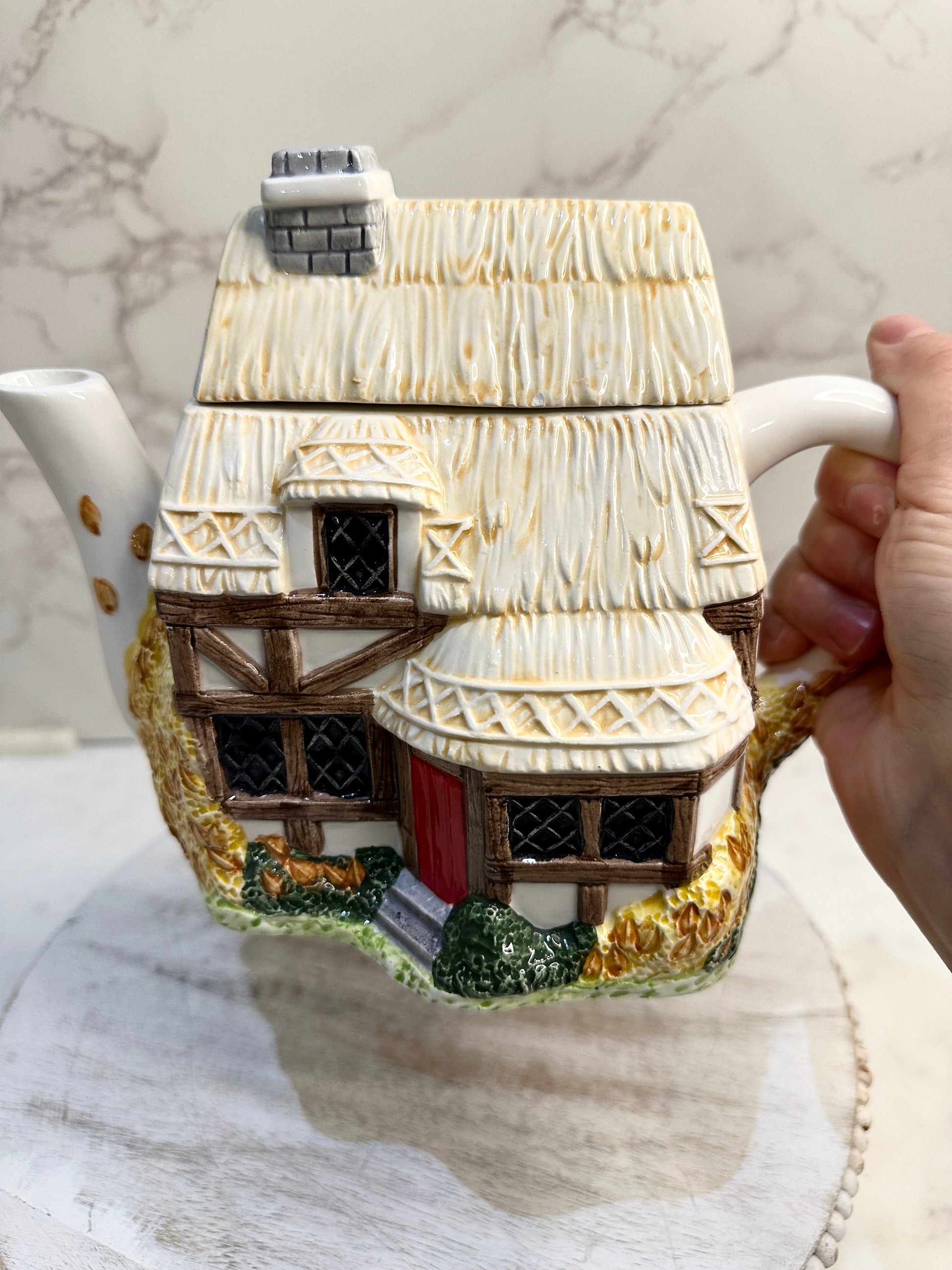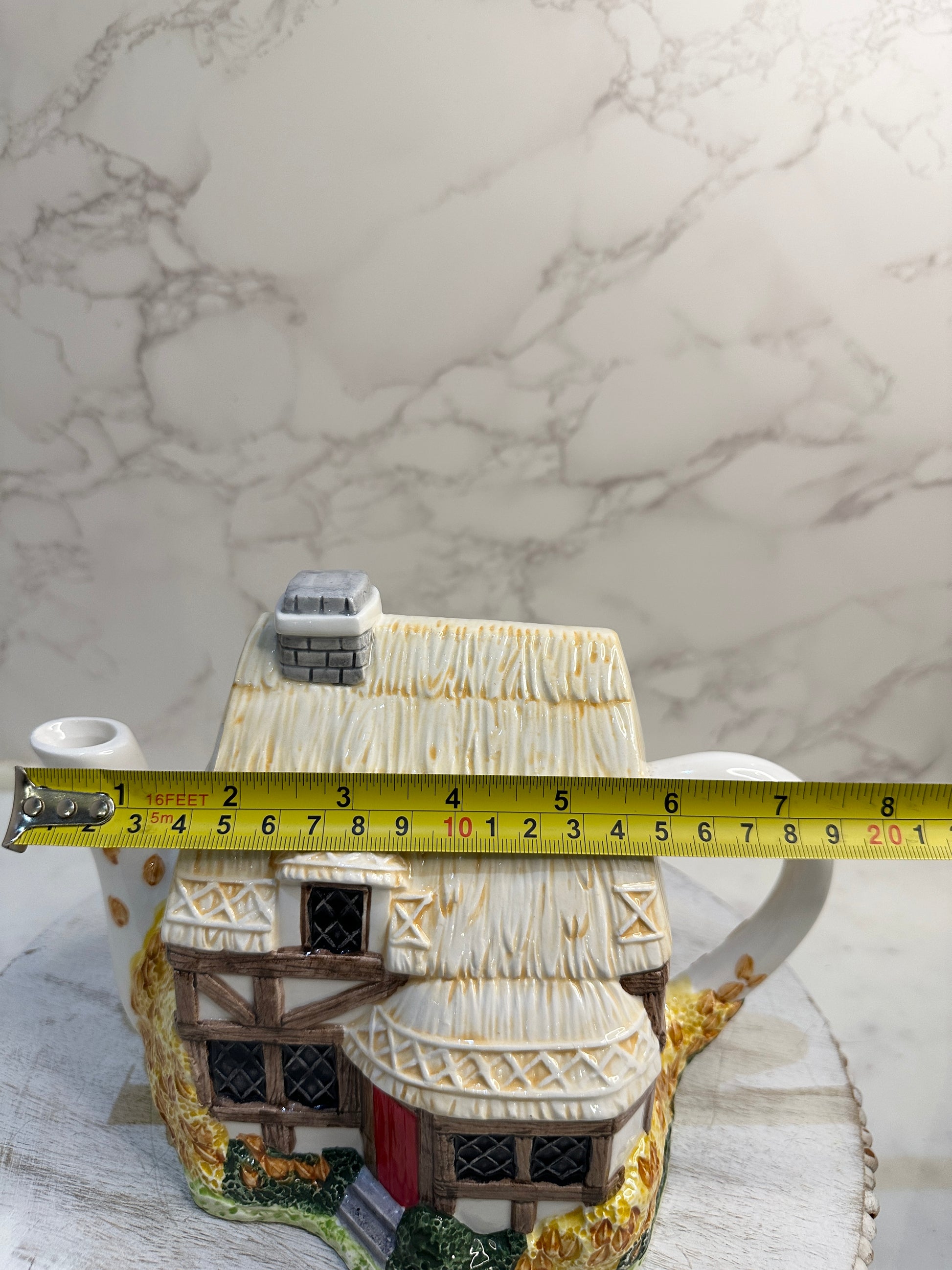 Charming handpainted ceramic teapot shaped like an English thatched-roof cottage. Designed by Annie Rowe for The Village Teapot Collectables by Western House Gifts, this delightful piece captures cozy countryside charm with a red front door, lattice windows, and floral details.