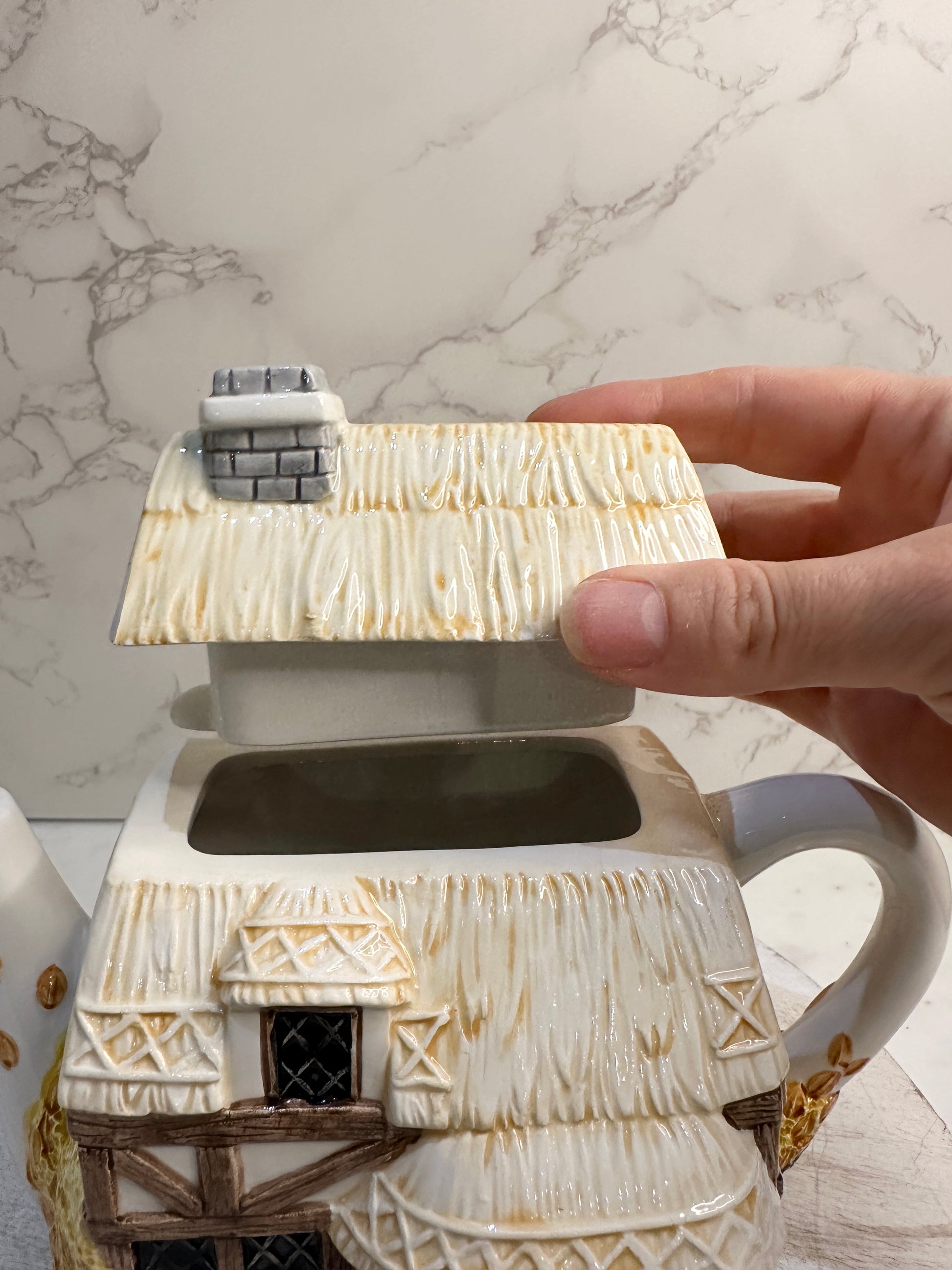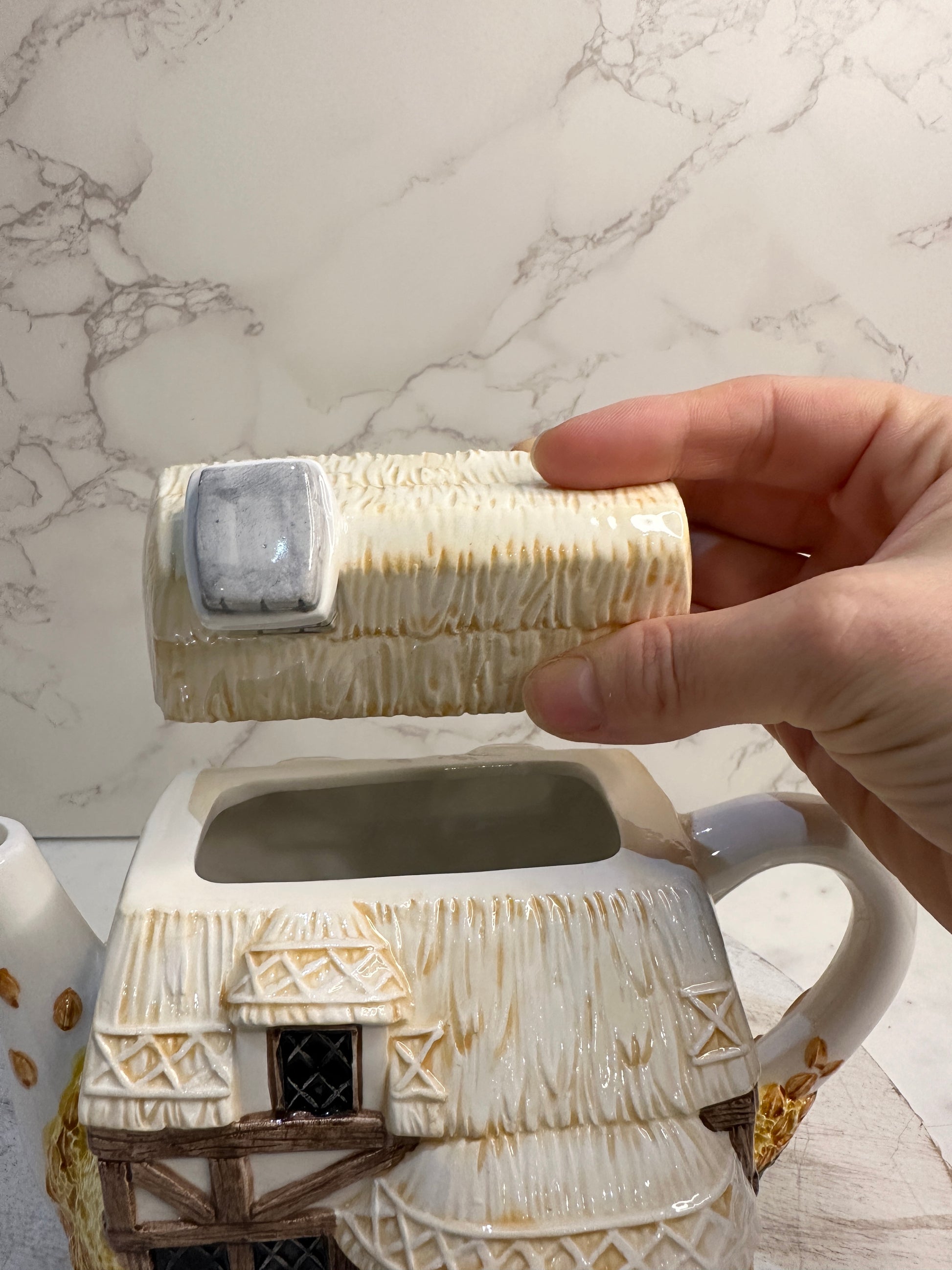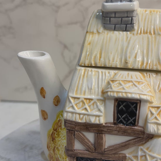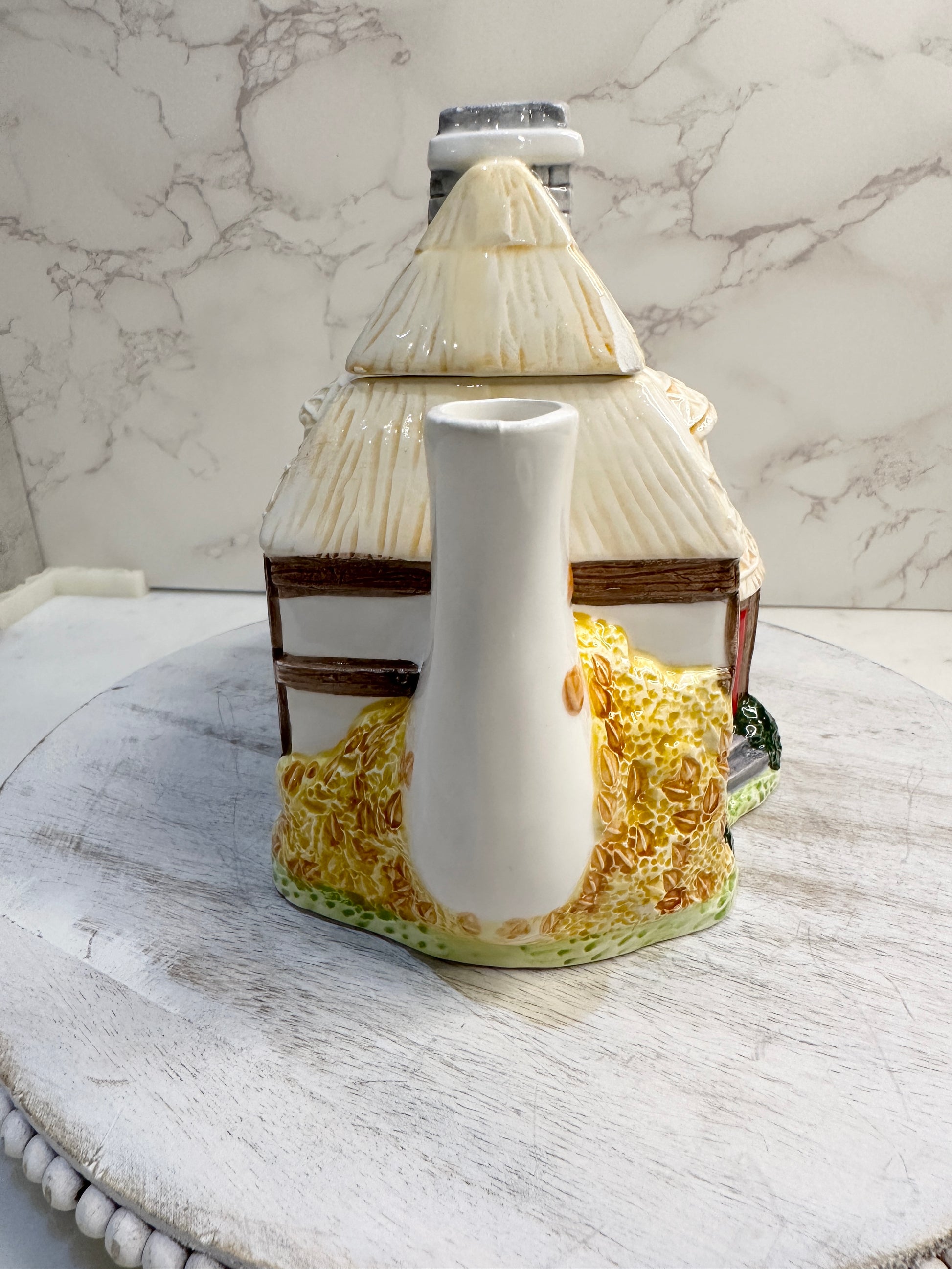 Charming handpainted ceramic teapot shaped like an English thatched-roof cottage. Designed by Annie Rowe for The Village Teapot Collectables by Western House Gifts, this delightful piece captures cozy countryside charm with a red front door, lattice windows, and floral details.