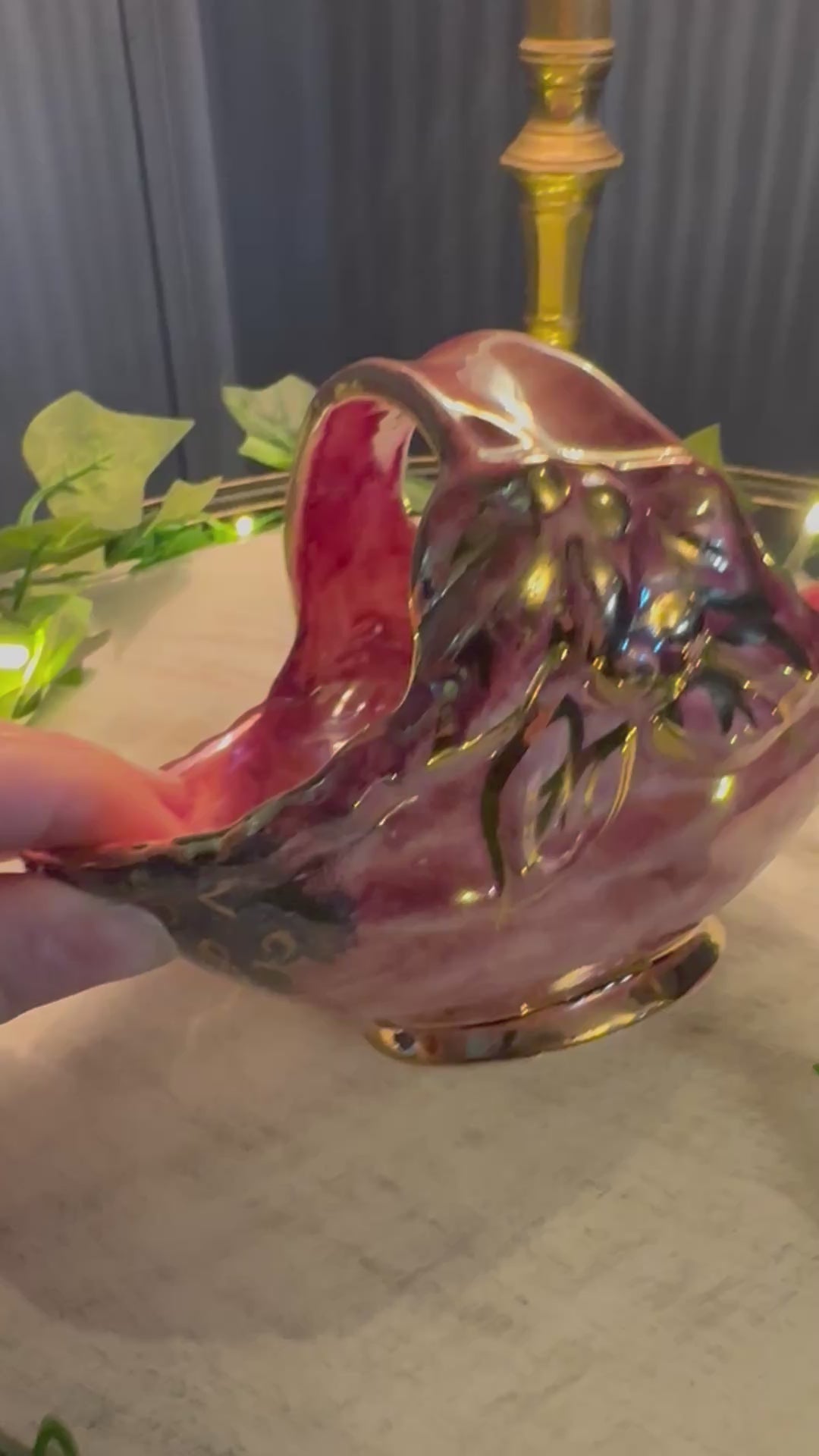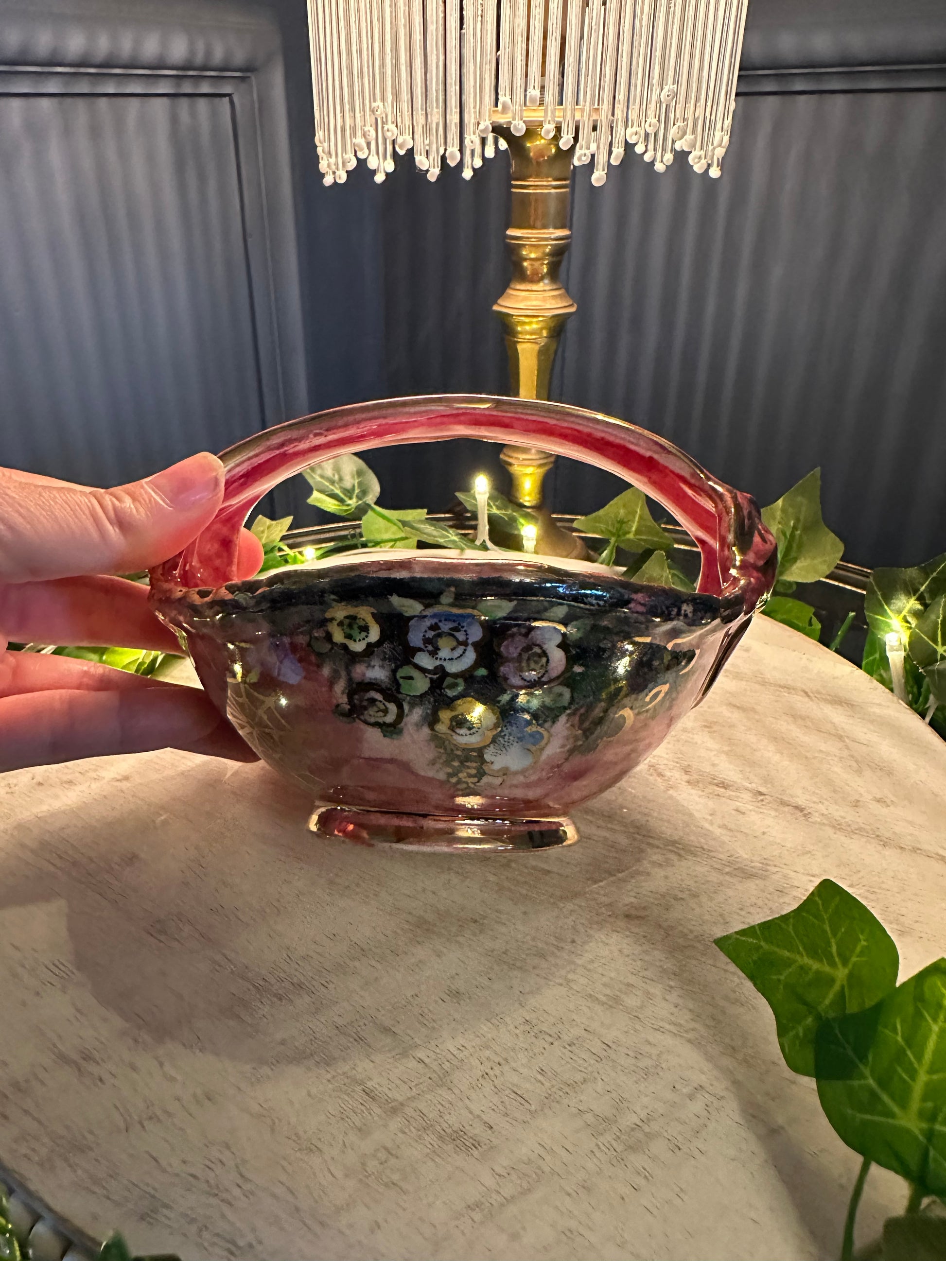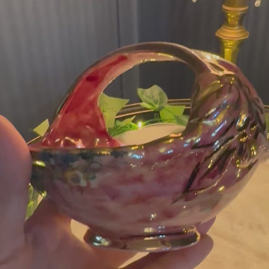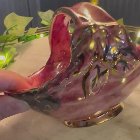 Add a touch of 1940s charm to your home with this exquisite Vintage Arthur Wood Royal Bradwell Pink Art Deco Basket. Handcrafted in England, this decorative ceramic basket features a striking marbled pink glaze with rich gold detailing, perfectly capturing the glamour of the Art Deco period.